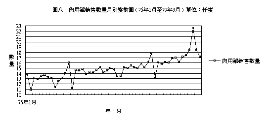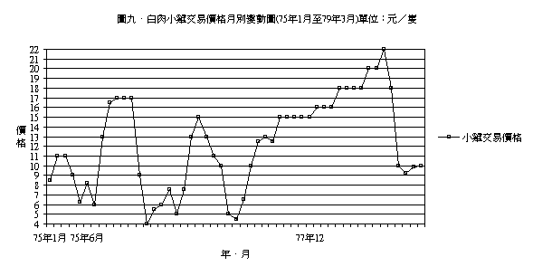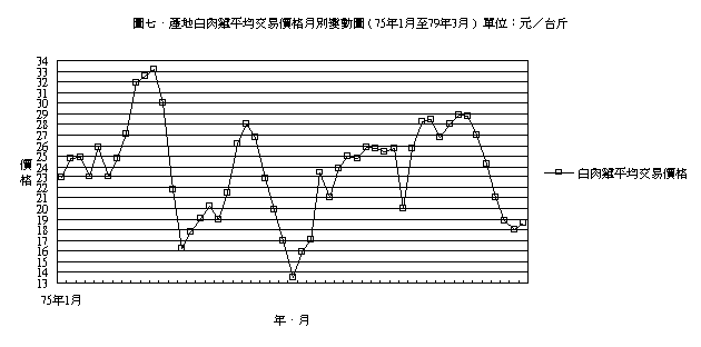圖七、為產地白肉雞平均交易價格月別變動圖,亦即北部地區、中部地區、嘉南地區、高屏地區四個產地交易價格之月平均價格,在圖中我們可以看出每年的7、8、9月的價格呈上昇的趨勢,但最近兩年 ( 77、78年 ) 其季節變動趨勢顯然與過去並不相同,如再與圖八、肉用雞銷售數量月則變動圖重疊比較,更可清晰地看出價量相反的變動的趨勢,此乃因肉用雞產量過多。