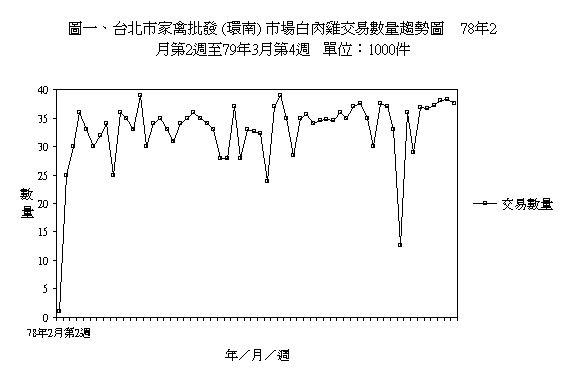 圖一、台北市家禽批發 ( 環南 ) 市場,白肉雞交易數量趨勢圖。圖中可看出每週的交易數量大致維持在35000件左右,而其中78年2月第2週及79年元月第五週顯著的下降,乃因農曆過年的關係,其餘下降量也均與節慶後有關。