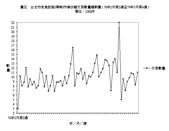 圖三、為台北市家禽批發 ( 環南 ) 市場土雞交易數量趨勢圖,由圖中我們不難發現,土雞的交易數量有著平緩增加的趨勢,尤其是78年8月以前土雞的交易數量,大約維持在12000件左右,而自78年9月起,前增至15000至20000件的銷售水準。