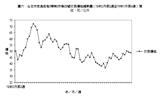 是將圖三、環南市場土雞交易數量圖與本圖合併起來,不難發現在78年8月以前雖然價格呈現波動的趨勢,但其仍維持在50元以上,而78年9月以後,則恰好相反,大多數交易價格均在50元以下,雖然在79年元月以後呈現些許的反彈,但仍處於50元以下,似與交易量呈相反的趨勢。