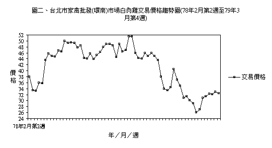 圖二、為台北市家禽批發 ( 環南 ) 市場白肉雞交易價格變動趨勢,由圖中可看出,市場的白肉雞交易價格波動甚大,量多價就跌,此種情況可將圖一與圖二兩張圖表重疊起來,就可窺知一 二。