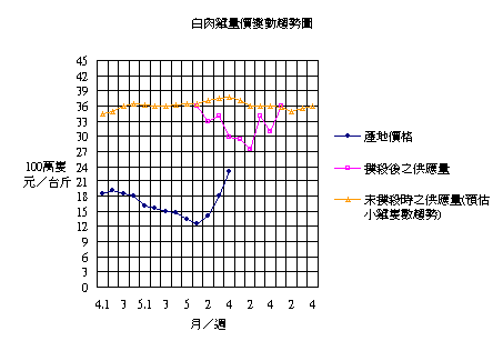 撲殺行動連續進行七週,預計可減少肉雞供應量約計三百四十萬隻。由於事先計劃執行日期與數量估計的正確,故自六月第二週起果然雞價止跌回升,自六月第二週的12元回漲至六月底的20元左右。但應加注意的是,此項撲殺行動自五月初至六月中連續進行七週後即已停止,而未再繼續進行。對照肉雞供應的時期,市場供應量的壓力將自六月第二週起減少,而可持續至七月底。因此雞價的回升亦可持續至七月底。故自八月起此項支撐雞價回升的動力即又消失,亦即自八月起肉雞供應的壓力又將回升至原來的趨勢,預計屆時雞價又將疲軟下跌。