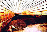 - 每籠 ( 50cm×50 — 55cm ) 飼養五~六隻。籠與籠之隔間採實板,以減少啄毛之現象。雞籠前之鐵條為橫式而非台灣目前之縱式,據說可以減少磨擦發生脫羽之現象,故雞隻羽毛比較美觀。