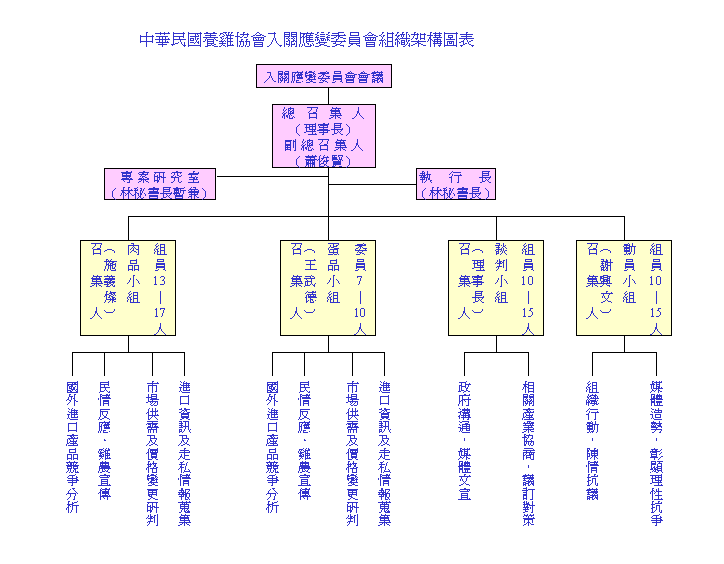 【本刊訊】本會為應我國加入GATT所可能引起之衝擊,前於82年12月成立「入關應變小組」,其後召開二次小組會議,咸認為此一臨時任務編組架構,有必要加強,故於本 ( 83 )年3月21日開會決定,將原小組改編為「入關應變委員會」,除指定本會理事長為當然總召集人外,另選定副總召集人、執行長及各小組召集人人選。該委員會下設肉品、蛋品、談判及動員等四小組,按各小組功能加強運作。