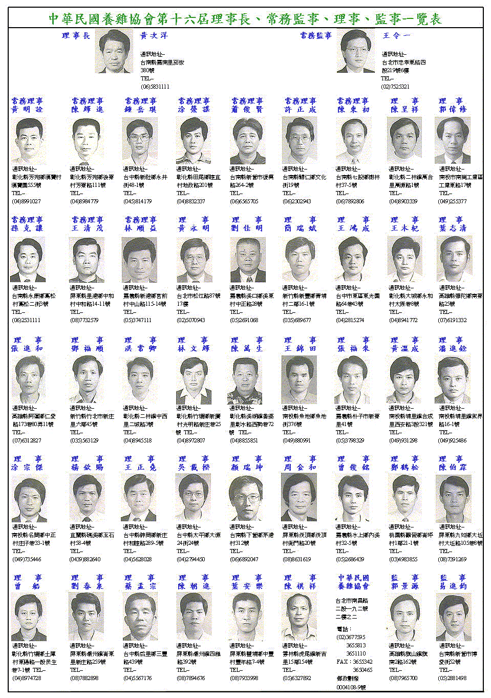 中華民國養雞協會第十六屆理事長、常務監事、理事、監事一覽表