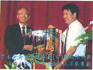 服務黃豆協會 25年的陳世爵博士,在同 (九) 月底,同時退休,可謂功成身退,為感謝陳博士對台灣畜牧界的貢獻,本會特定製大型紀念盃由黃理事長親自贈送陳博士紀念。
